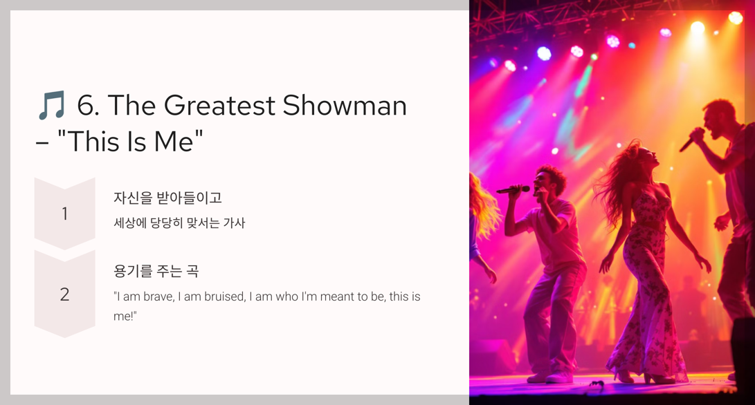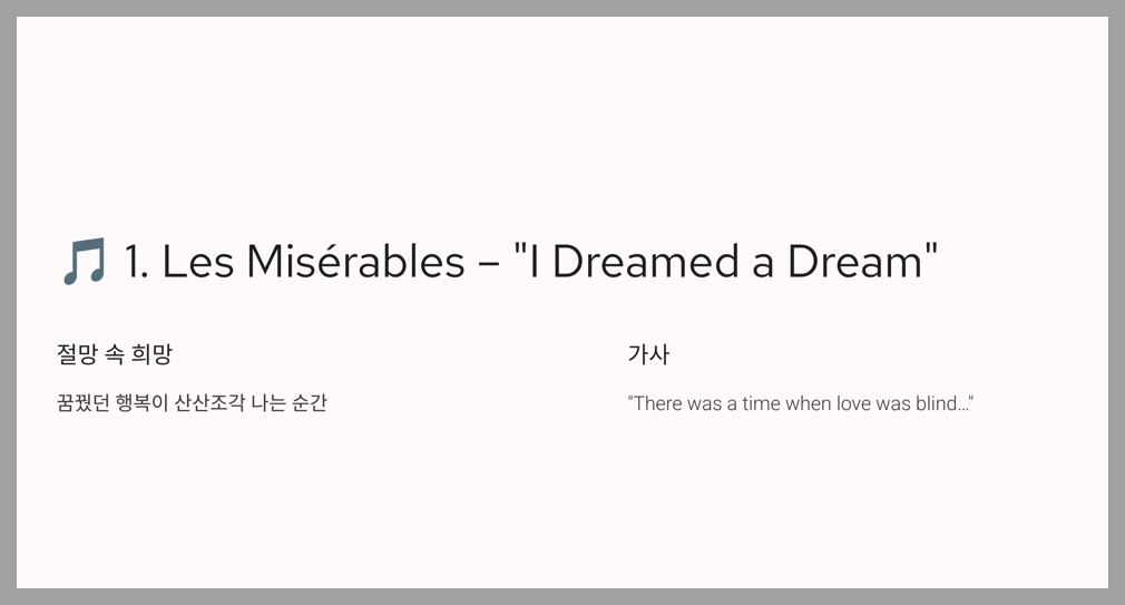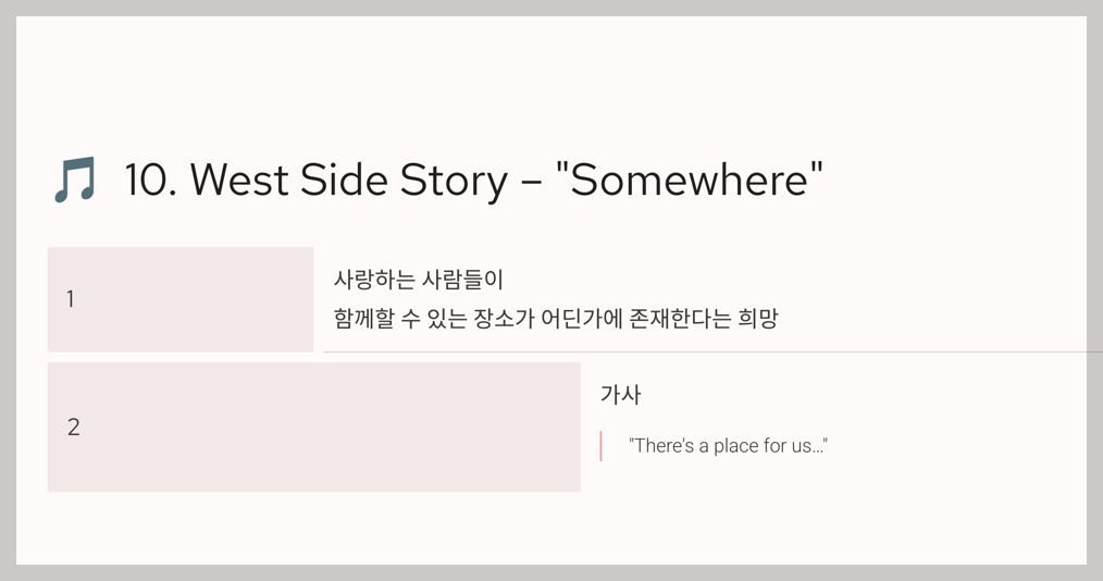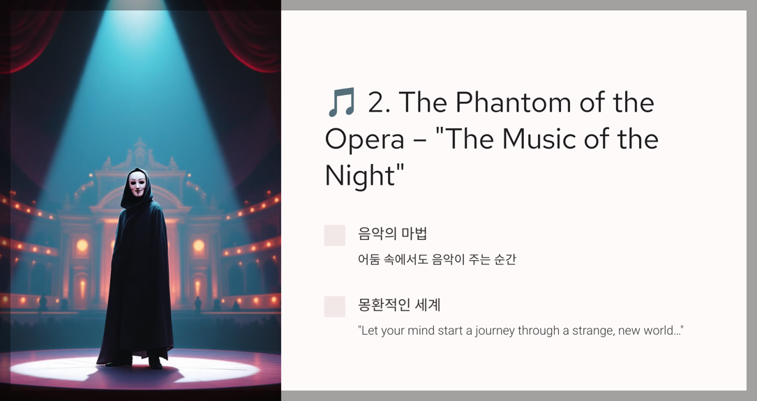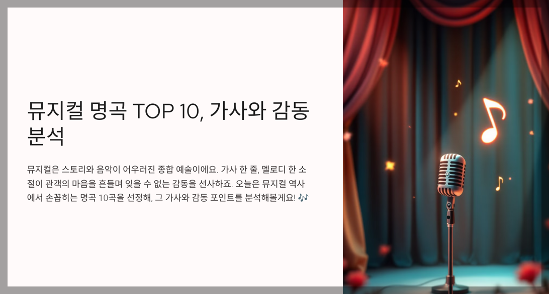 오늘은 뮤지컬 역사에서 손꼽히는 명곡 10곡을 선정해, 그 가사와 감동 포인트를 분석해 볼게요! 🎶