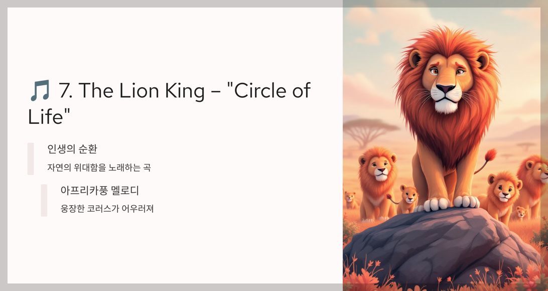 아프리카풍 멜로디와 웅장한 코러스가 어우러져 극의 분위기를 압도하죠.