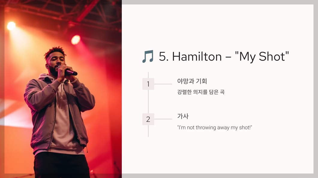 "I'm not throwing away my shot!"라는 가사는 현대적인 랩과 어우러져 강한 인상을 남겨요.