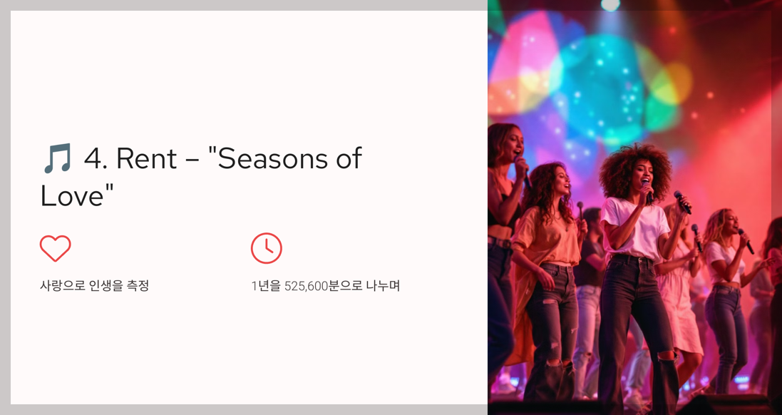 1년을 525,600분으로 나누며 사랑으로 인생을 측정해야 한다는 따뜻한 메시지를 전달해요.