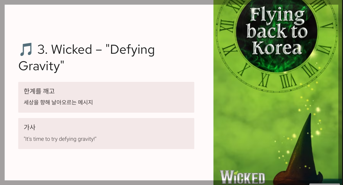 자신의 한계를 깨고 세상을 향해 날아오르는 메시지를 담고 있어요. "It's time to try defying gravity!"라는 가사가 들리면 가슴이 벅차오르죠.