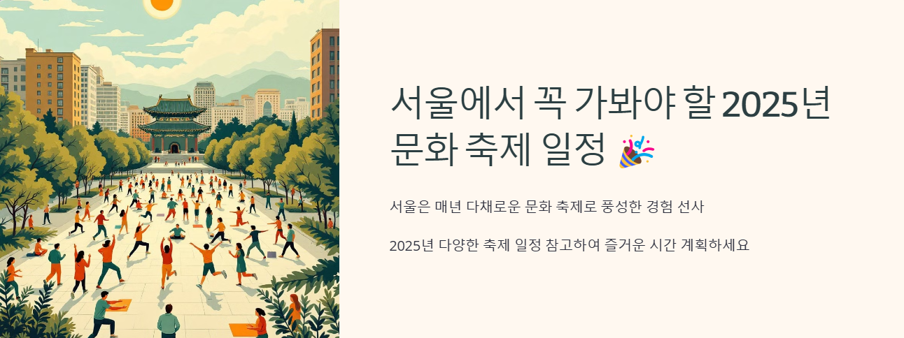 2025년 서울은 사계절 내내 풍성한 문화 축제로 가득합니다. 위의 일정을 참고하셔서 소중한 사람들과 함께 특별한 추억을 만들어보시기 바랍니다.