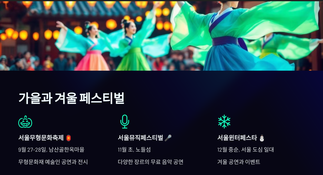 - 소개: 겨울을 맞아 서울 도심 곳곳에서 열리는 축제로, 다양한 공연과 이벤트가 무료로 진행됩니다. 겨울의 낭만을 느껴보세요.