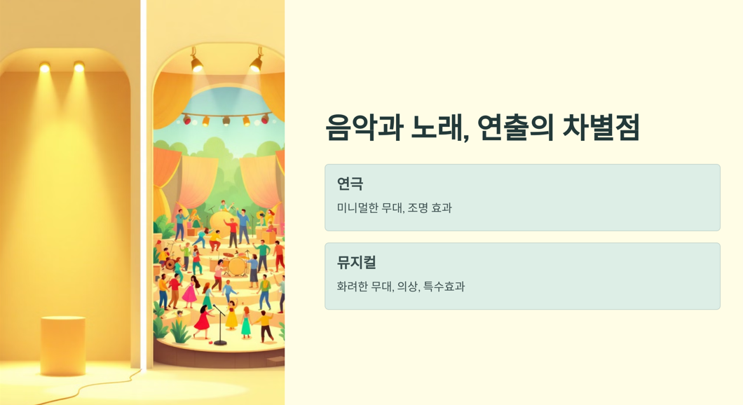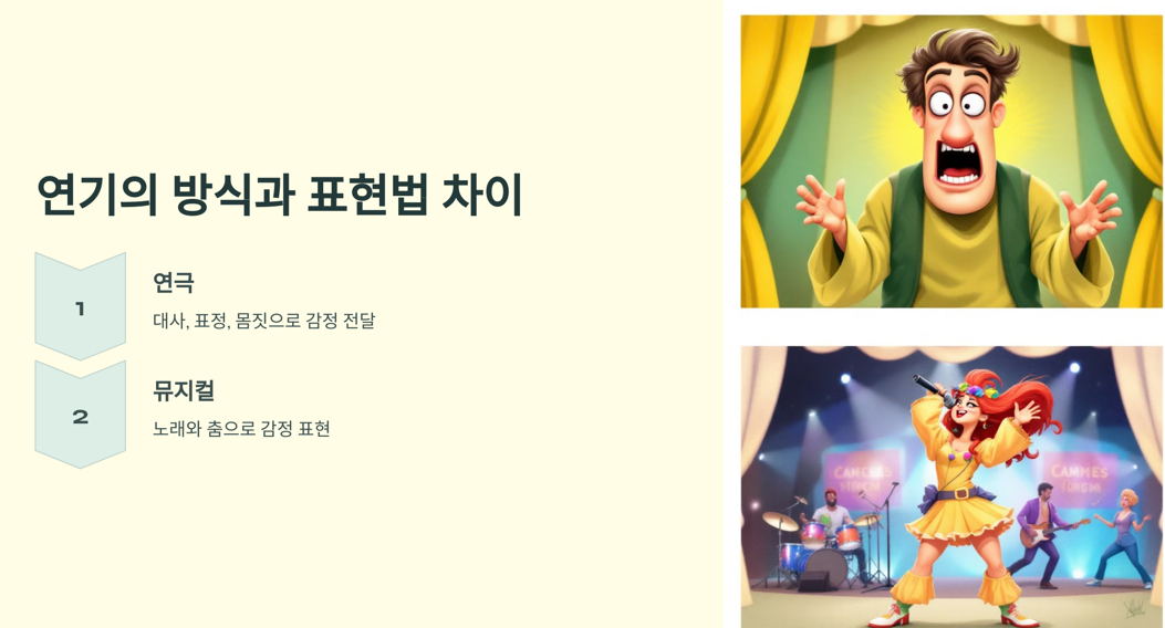 즉, 연극은 대사가 핵심이라면, 뮤지컬은 음악과 퍼포먼스가 중요한 요소라고 볼 수 있어요.