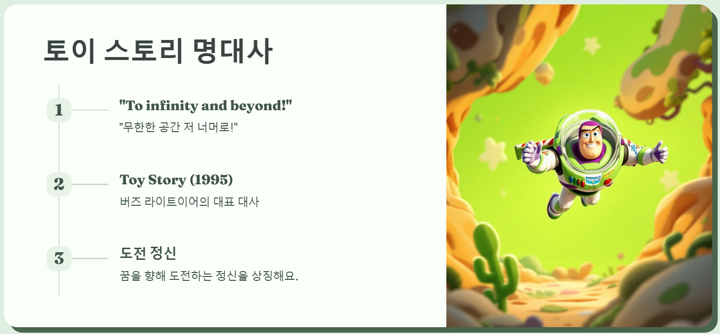 버즈 라이트이어가 외치는 이 대사는 꿈을 향해 도전하는 정신을 상징해요. 불가능해 보이는 일도 도전해 보면 가능성이 생길지도 몰라요!