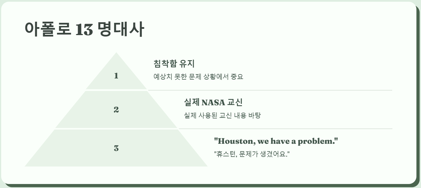 실제 NASA에서 사용된 교신 내용을 바탕으로 한 이 대사는 예상치 못한 문제 상황에서 침착함을 유지하는 게 중요하다는 걸 알려줘요.