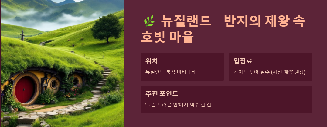 뉴질랜드는 <반지의 제왕>과 <호빗> 시리즈의 배경이 된 곳이에요. 가장 유명한 장소는 마타마타(Matamata)에 있는 ‘호빗 마을’입니다. 동그란 문이 있는 호빗들의 집과 아름다운 초원 풍경은 마치 영화 속 한 장면에 들어온 듯한 느낌을 줘요.
