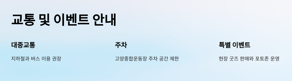- 주차: 고양종합운동장 내 주차 공간이 제한되어 있으므로, 가능한 한 대중교통을 이용해 주세요.