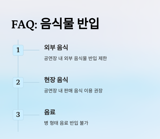 공연장 내에서는 외부 음식물 반입이 제한될 수 있으므로, 현장에서 판매되는 음식을 이용해 주시기 바랍니다.