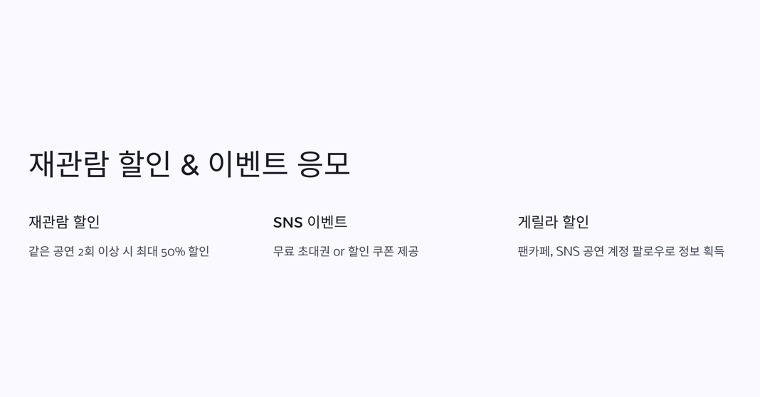 - 공연 리뷰 이벤트 참여 시 무료 초대권 or 할인 쿠폰 제공