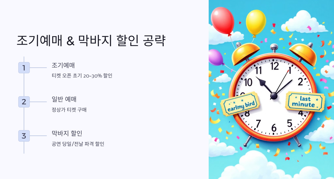 공연 예매처에서 "당일 할인" 카테고리를 확인하거나, SNS에서 마지막 할인 정보를 찾아보세요!