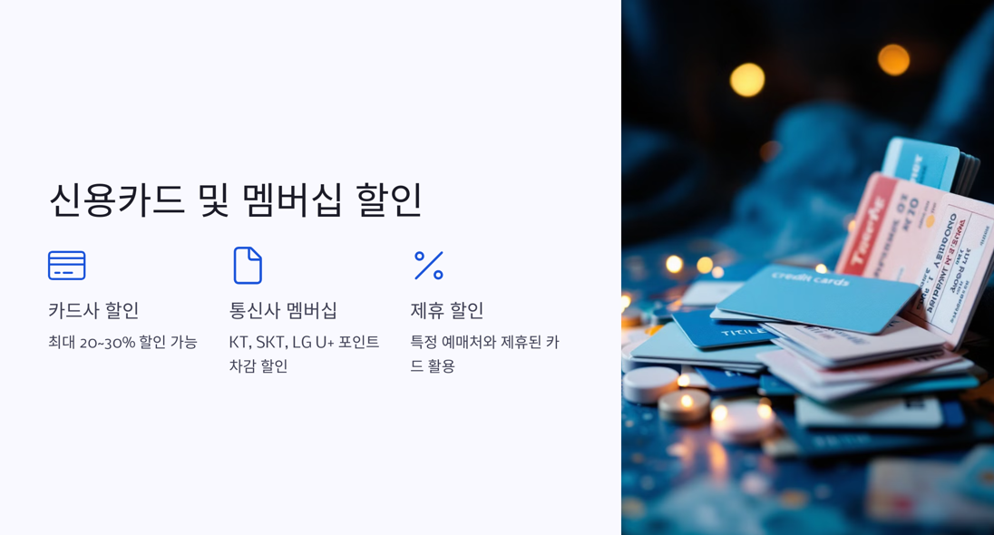 많은 카드사에서 공연 할인 혜택을 제공하고 있어요. 특히 특정 예매처와 제휴된 카드가 있다면 최대 20~30%까지 할인 가능!