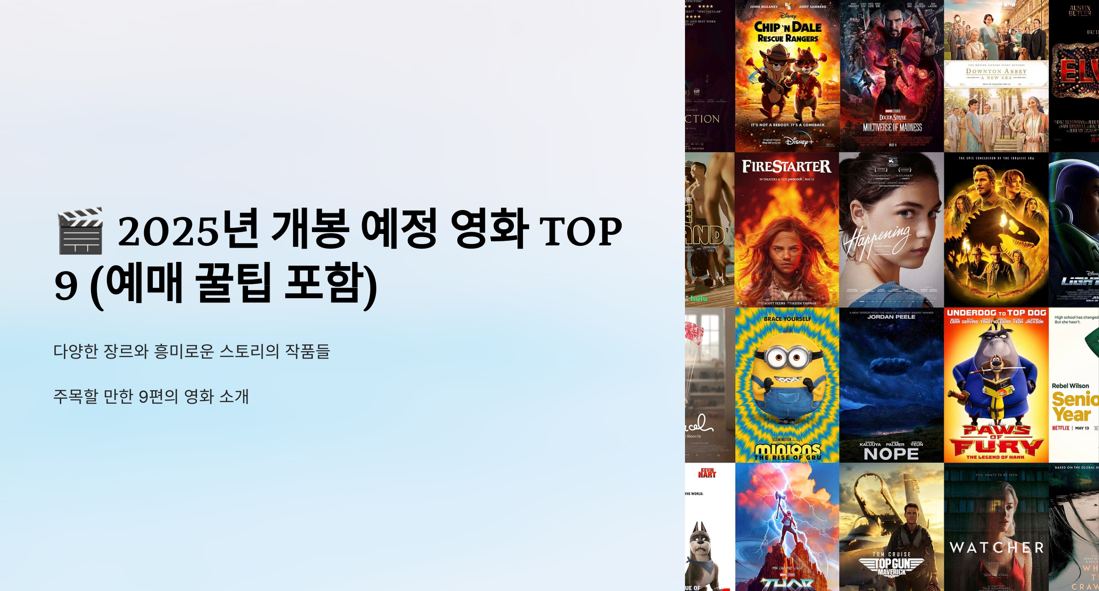 2025년은 영화 팬들에게 풍성한 한 해가 될 것으로 기대됩니다. 다양한 장르와 흥미로운 스토리를 가진 작품들이 개봉을 앞두고 있는데요, 그중에서도 주목할 만한 9편의 영화를 소개해 드리겠습니다. 🎥