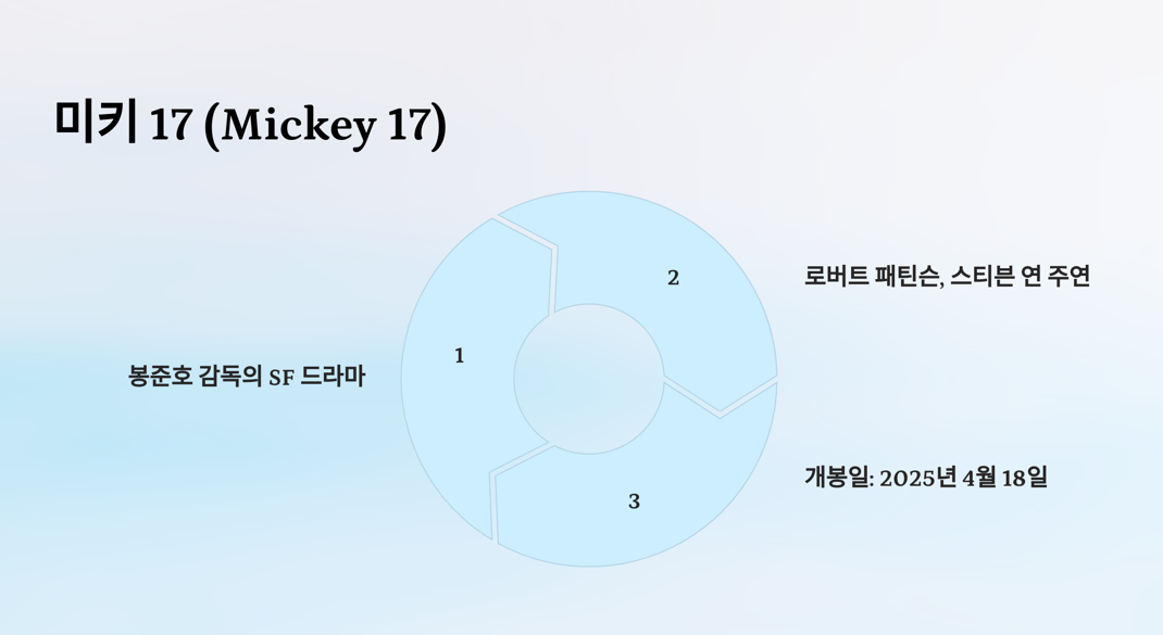 봉준호 감독이 연출하는 SF 드라마로, 복제인간 '미키'의 이야기를 통해 인간 존재와 정체성을 탐구합니다. 로버트 패틴슨과 스티븐 연이 주연을 맡았으며, 개봉일은 2025년 4월 18일입니다.