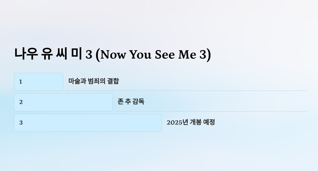 마술과 범죄를 결합한 시리즈의 세 번째 작품으로, 기존 캐릭터와 새로운 인물이 함께하는 긴장감 넘치는 이야기가 펼쳐질 예정입니다. 존 추 감독이 연출하며, 2025년 개봉 예정입니다.