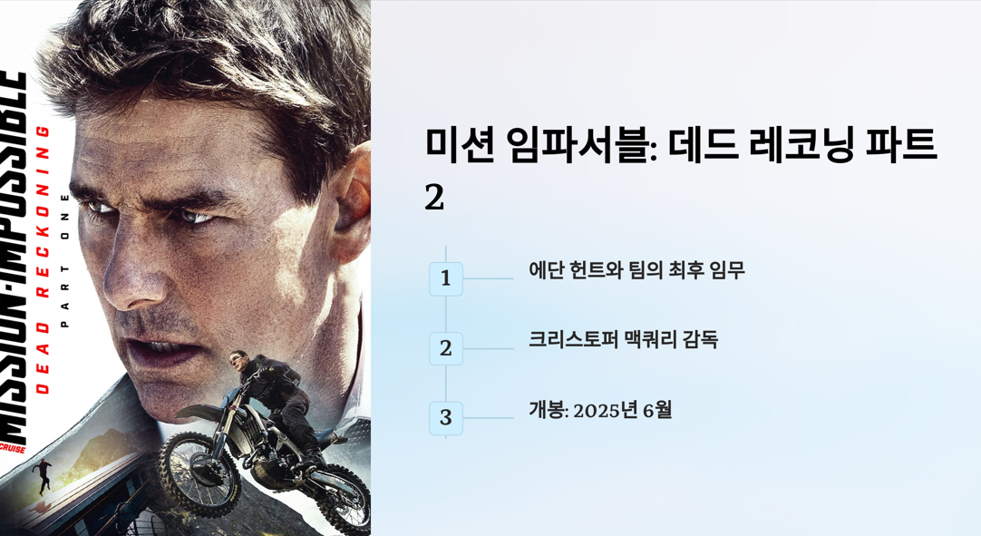 에단 헌트와 그의 팀이 전 세계를 무대로 최후의 임무를 수행하는 이야기를 담은 시리즈의 최신작입니다. 크리스토퍼 맥쿼리 감독이 연출하며, 2025년 6월 개봉 예정입니다.