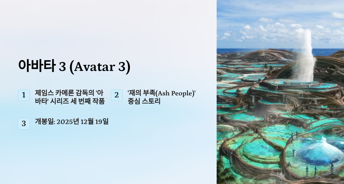 제임스 카메론 감독의 '아바타' 시리즈 세 번째 작품으로, 판도라 행성의 새로운 부족인 '재의 부족(Ash People)'을 중심으로 불과 재의 세계를 탐험하는 이야기가 펼쳐집니다. 개봉일은 2025년 12월 19일로 예정되어 있습니다.