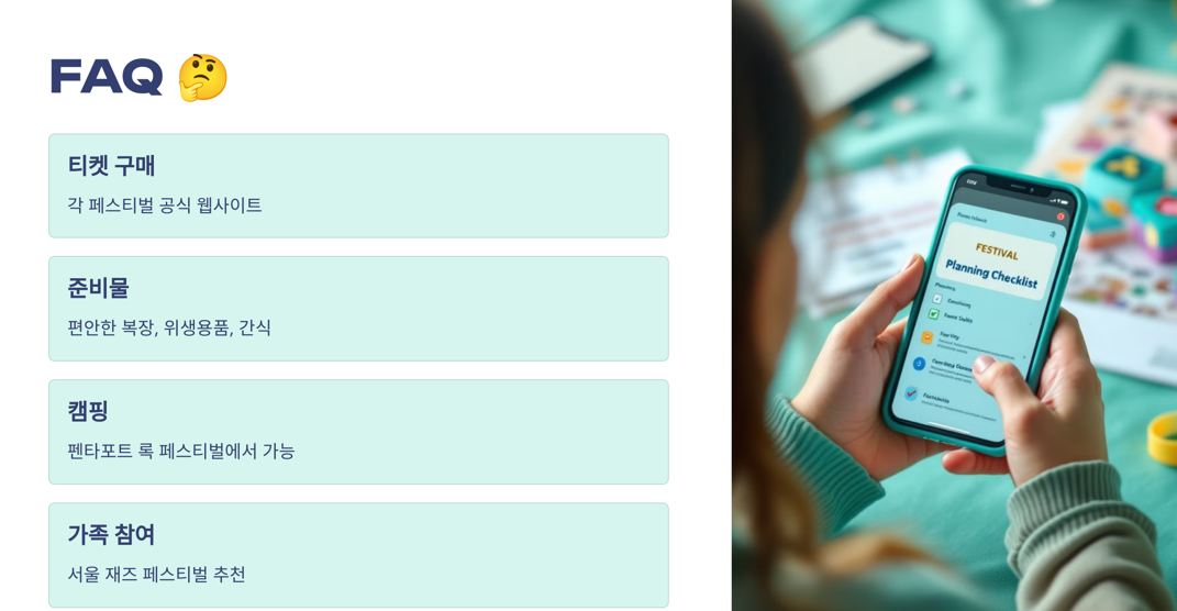 - A2: 편안한 복장과 신발, 개인 위생용품, 간단한 간식과 물 등을 준비하시면 좋습니다. 또한, 각 페스티벌의 규정을 사전에 확인하여 반입 금지 물품 등을 숙지하시기 바랍니다.