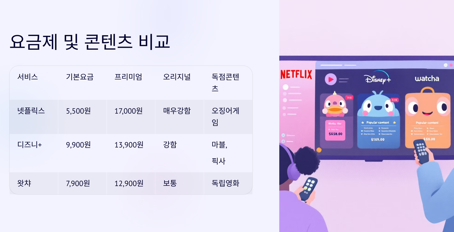 | OTT 서비스 | 기본 요금제 | 프리미엄 요금제 | 오리지널 콘텐츠 | 독점 콘텐츠 |