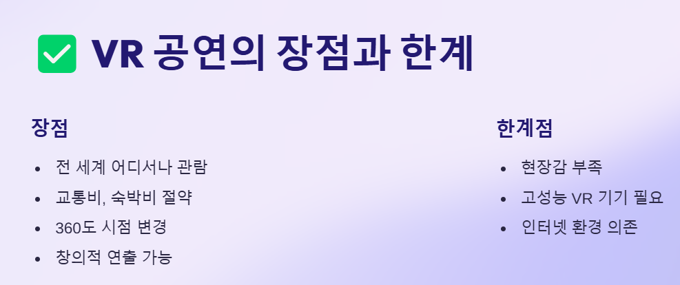 즉, VR 공연은 현실의 제약을 뛰어넘어 더 많은 사람들에게 공연을 즐길 기회를 제공한다는 장점이 있어요.