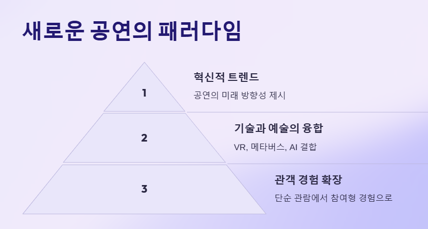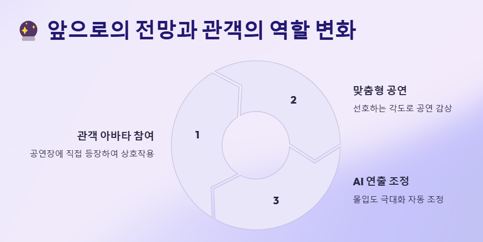앞으로 공연 산업은 VR과 메타버스를 중심으로 더욱 발전할 거예요. 관객은 단순한 소비자가 아닌, 공연의 일부가 되는 시대가 올 가능성이 커요.